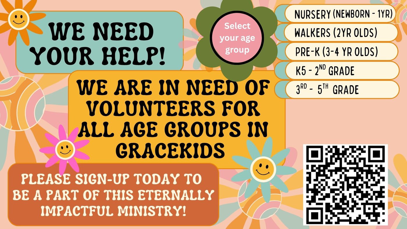 Click Here to sign up. In the email please put graceKids in the subject line along with your name, class you would like to serve and your phone number.